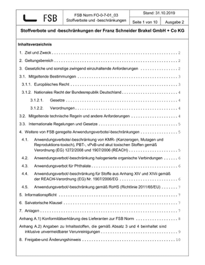 Der Auftragnehmer wird bei der Leistungserbringung alle nach anwendbarem Recht einschlägigen Normen, Gesetze und Rechtsvorschriften, insbesondere die einschlägigen Sicherheits-, Umweltschutz-, Gefahrstoff-, Gefahrgut- und Unfallverhütungsvorschriften beachten, sowie die allgemein anerkannten sicherheitstechnischen Regeln und die entsprechenden Vorgaben des Auftraggebers und des Endkunden einhalten. Mitgeltend ist die FSB Norm für Stoffverbote und -beschränkungen, die auf der Website des Auftraggebers (www.fsb.de) einsehbar ist.