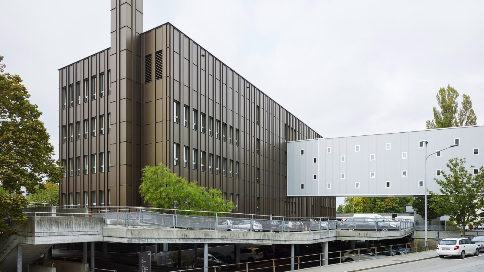 The redevelopment turns a fragmented ensemble into a coherent system. Inspired by the historic St. Gallen monastery complex, the master plan creates an interconnected fabric of paths, plazas, and green spaces. Building 10 forms the heart of the complex: a six-story structure that consolidates outpatient clinics and replaces three older buildings as well as the emergency power facility.